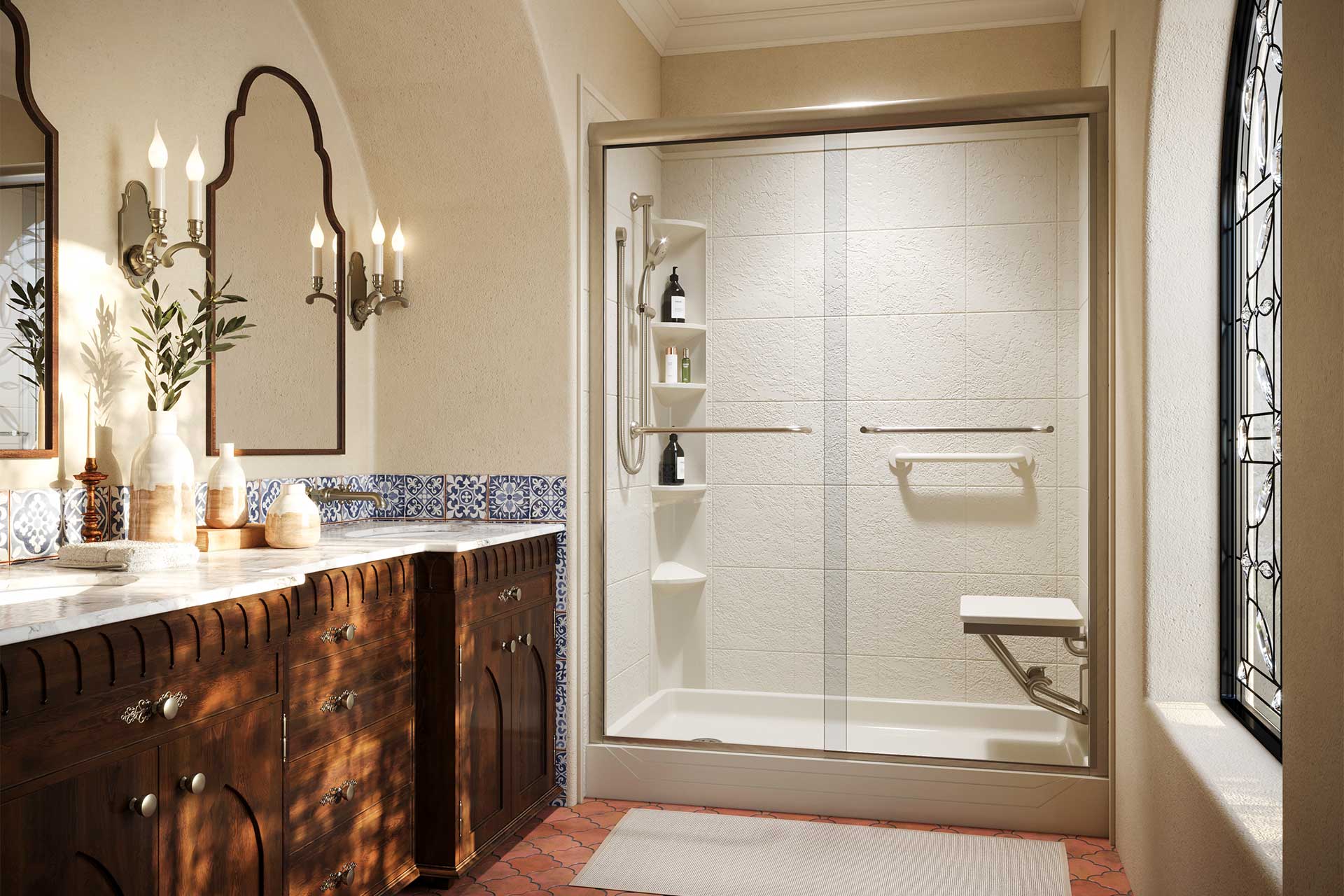 Customize your new bathing area with glass shower doors, faucets, corner seats, soap dishes, wainscoting, curved or straight shower rods, grab bars, soap dishes, shelving, and more.